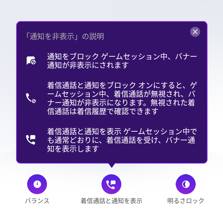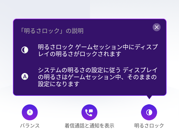 ゲーム中、カクついて満足に楽しめないなぁ…なんて思っている、ゲームアプリユーザーさんには必見の機能も搭載されています。 ゲームを始めると、CPUは自動的にパフォーマンスを高めて稼働します。 (CPUってなに?という方へ…コンピューターの脳みそ部分という感じです。)さらに、ゲーム中のスマートフォンの状態を「バランス」「ブロックバナー通知」「明るさロック」で調節ができます。